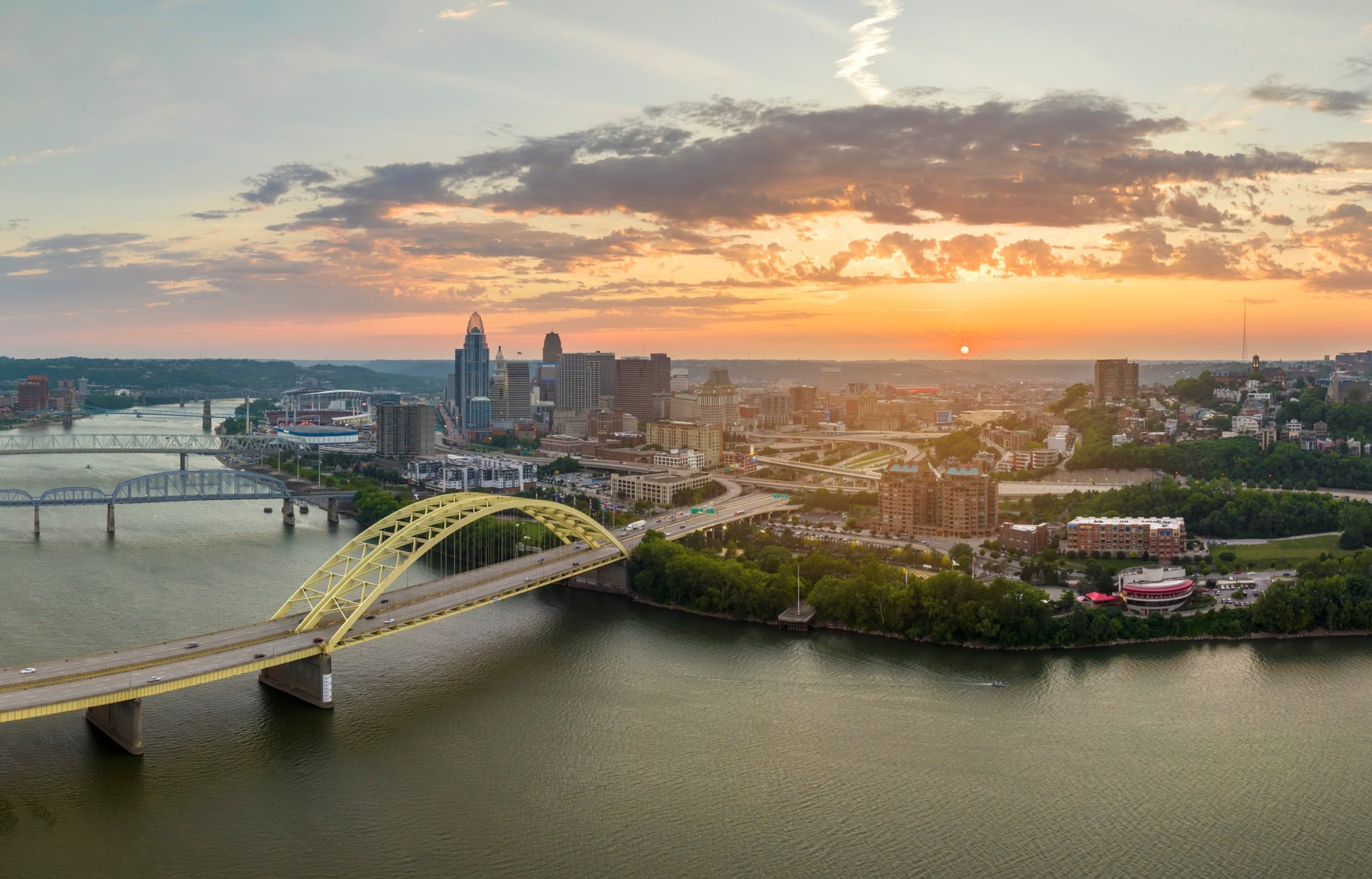 Cincinnati ligt in het zuidwesten van Ohio, precies op de grens met Kentucky, gescheiden door de Ohio River. Dat maakt de stad tot een soort bruggenstad, letterlijk én figuurlijk. De historische John A. Roebling Suspension Bridge (de voorloper van de Brooklyn Bridge) verbindt de stad met het zuidelijke Newport, terwijl de bewoners zelf al generaties lang schakelen tussen Noord en Zuid qua cultuur, keuken en identiteit.