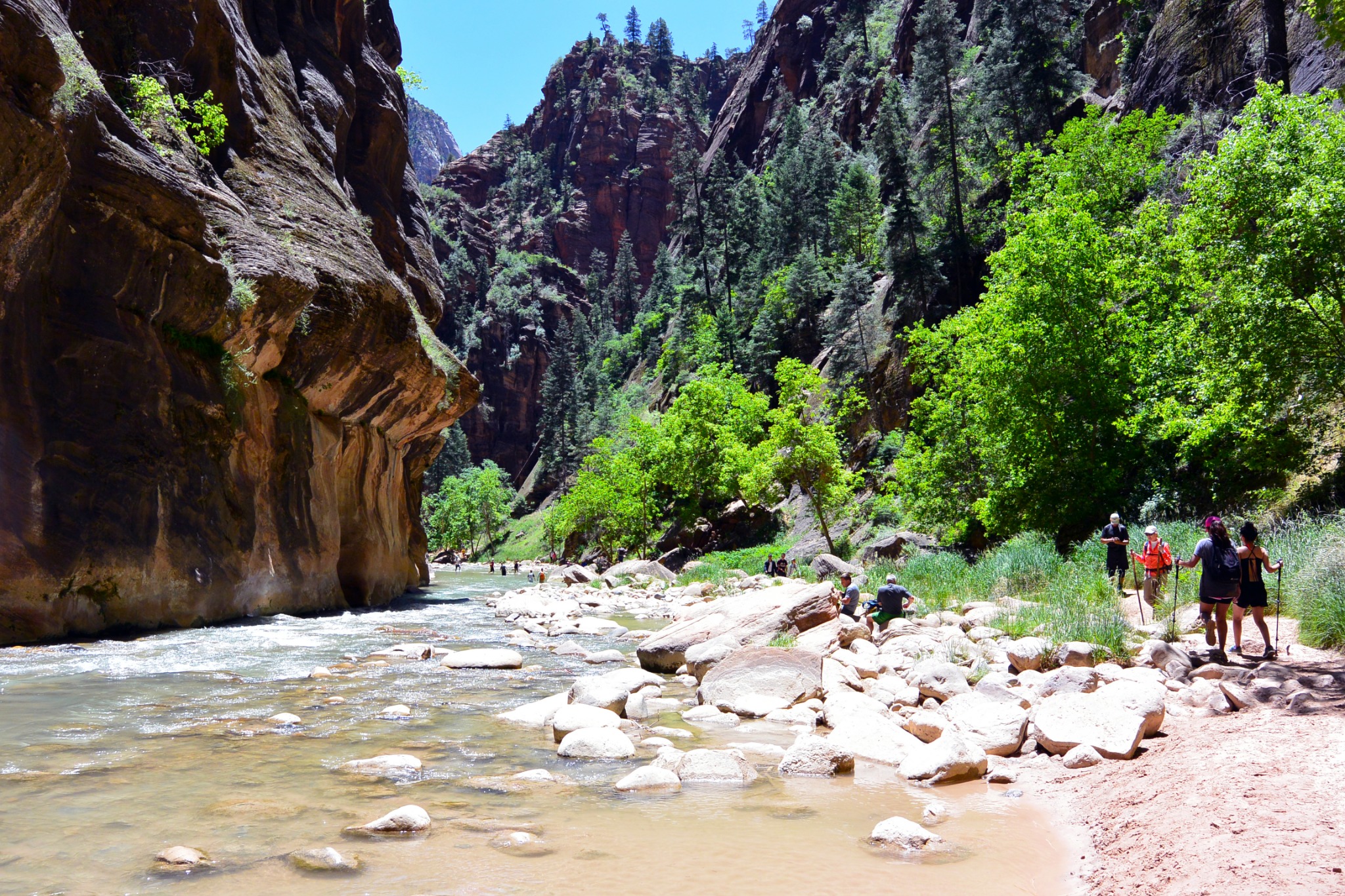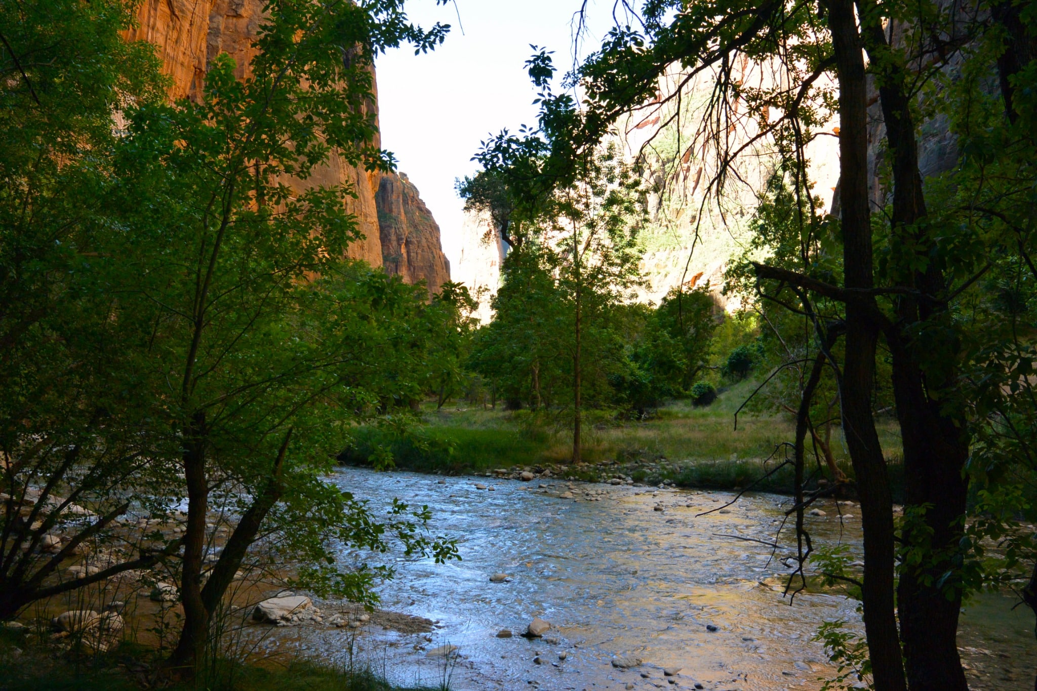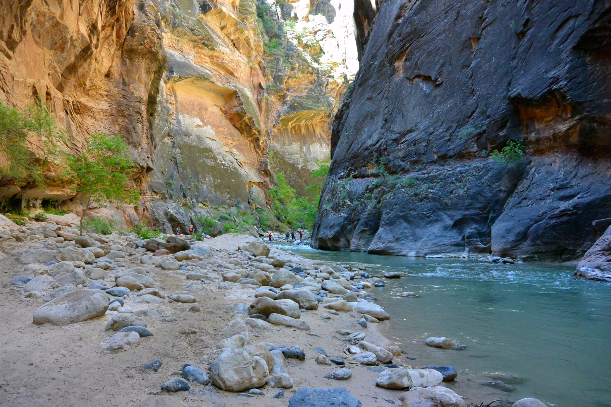 Minstens zo bijzonder, maar op een heel andere manier, is The Narrows. Hier loop je letterlijk ín de rivier, tussen torenhoge canyonwanden die je volledig omringen. Waterdichte schoenen zijn aan te raden – en een camera, want het lichtspel op de muren is ongeëvenaard.